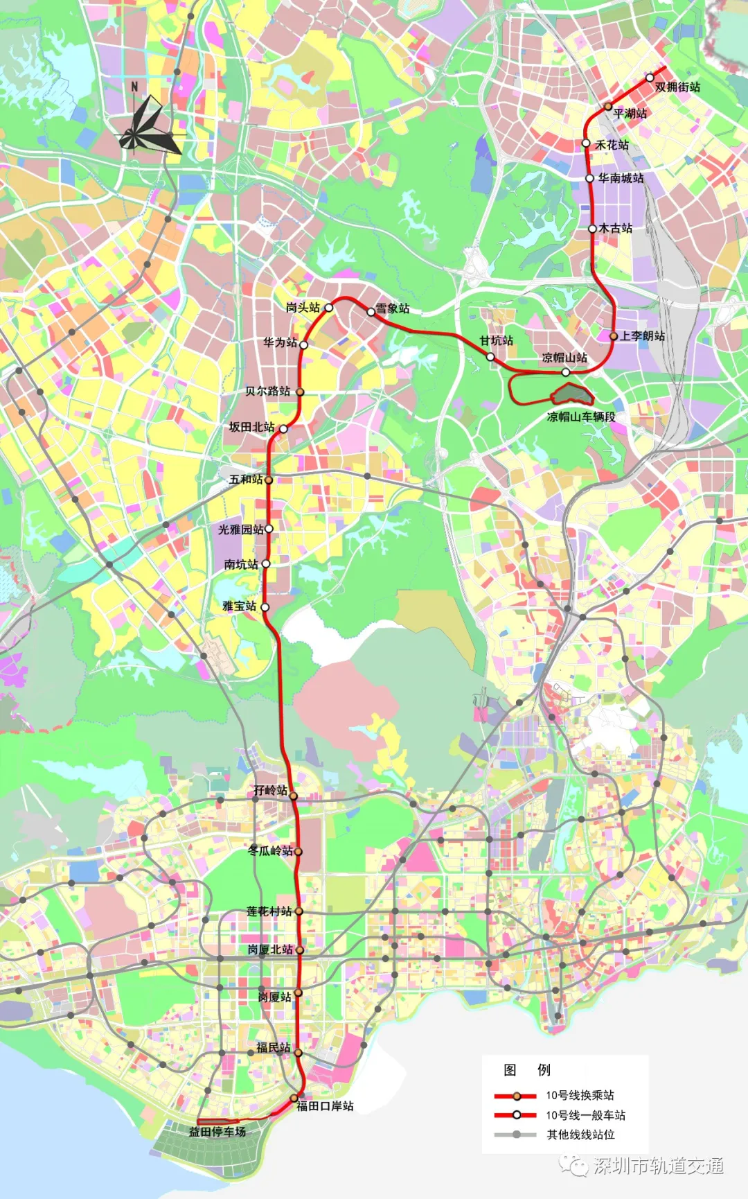 地鐵10號線起自福田區(qū)福田口岸站,終至龍崗區(qū)雙擁街站,途經(jīng)福田、龍華、龍崗3區(qū),線路全長約29km,采用全地下敷設(shè)方式,共設(shè)站24座(其中換乘站11座)。