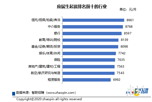 報(bào)告顯示,應(yīng)屆生起薪排名前十的行業(yè)中,信托/擔(dān)保/拍賣/典當(dāng)、中介服務(wù)、銀行等行業(yè)為起薪排名前三名,分別為8961元,8768元和8597元。除此之外,教育/培訓(xùn)/院校、娛樂/體育/休閑等受益于直播經(jīng)濟(jì)的帶動和數(shù)字化的發(fā)展,也向應(yīng)屆生開出了相對高的薪酬。