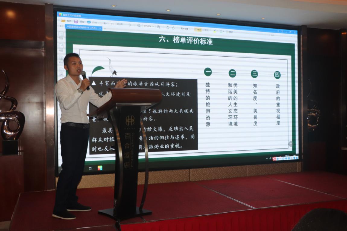 中國最美縣域榜單融媒體主任李帥向與會嘉賓介紹中國最美縣域榜單,并希望各地認(rèn)真踐行“綠水青山就是金山銀山”發(fā)展理念,建設(shè)“最美縣域”,共圓“美麗中國”夢。