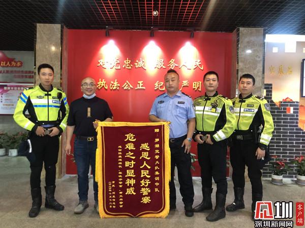 深圳新聞網(wǎng)訊(見圳客戶端、深圳新聞網(wǎng) 記者 郭含笑 通訊員 李曉萍)10月14日,群眾將一面題有“危難之時顯神威,感恩人民好警察”的錦旗送到羅湖交警大隊,感謝羅湖機訓中隊民警及鐵騎隊員在劉先生遇到困難時伸出援助之手。
