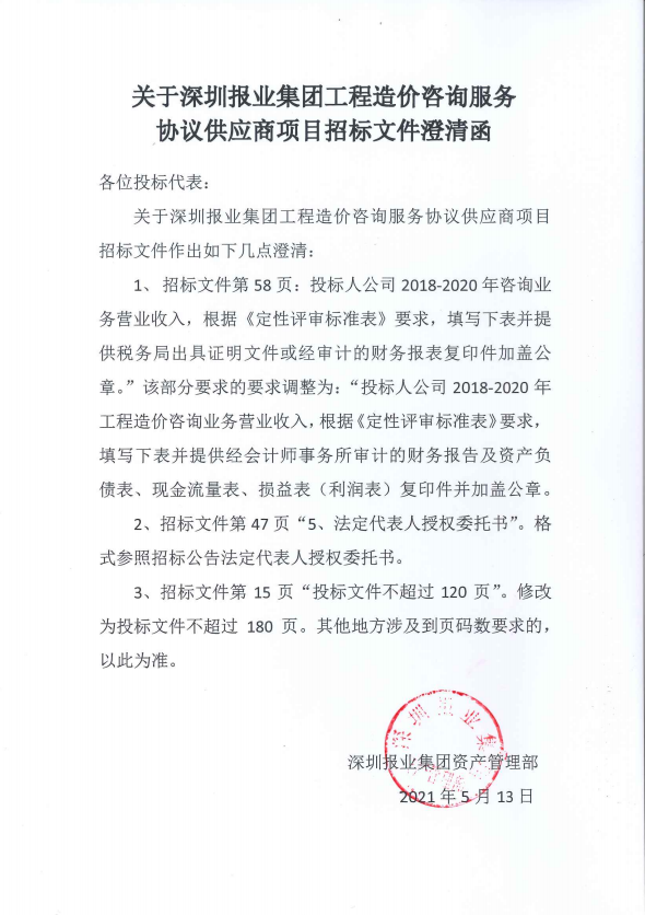 關于深圳報業(yè)集團工程造價資訊服務協(xié)議供應商項目招標文件澄清函