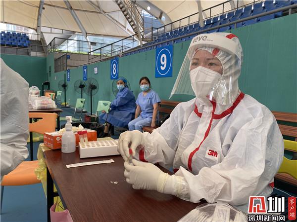 為提高轄區(qū)核酸檢測(cè)效率,羅湖區(qū)在羅湖區(qū)體育館搭建了臨時(shí)檢測(cè)點(diǎn),主要為轄區(qū)農(nóng)貿(mào)市場(chǎng)、商超、KTV等重點(diǎn)行業(yè)從業(yè)人群進(jìn)行核酸檢測(cè)。5月30日上午,記者來(lái)到羅湖區(qū)體育館網(wǎng)球館,只見一排的采樣作業(yè)臺(tái)有序排開,一米之外,是秩序井然的排隊(duì)人員。一張小小的采樣臺(tái),搭配兩名醫(yī)護(hù)人員,他們身穿防護(hù)服、頭戴防護(hù)罩,一名取集樣本、一名放置樣本,一個(gè)采樣流程下來(lái)不到兩分鐘,現(xiàn)場(chǎng)井然有序。烈日下,他們的汗水沿著防護(hù)罩流下來(lái),厚重的防護(hù)服下,支撐他們的是堅(jiān)守一線的責(zé)任感和使命感。
