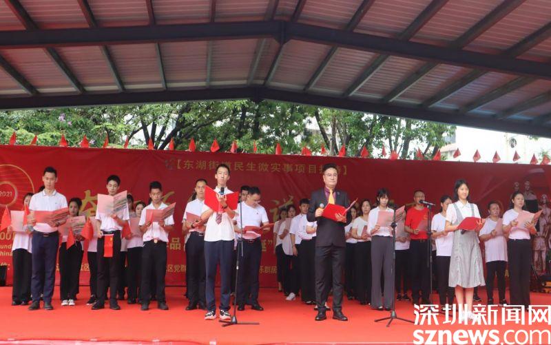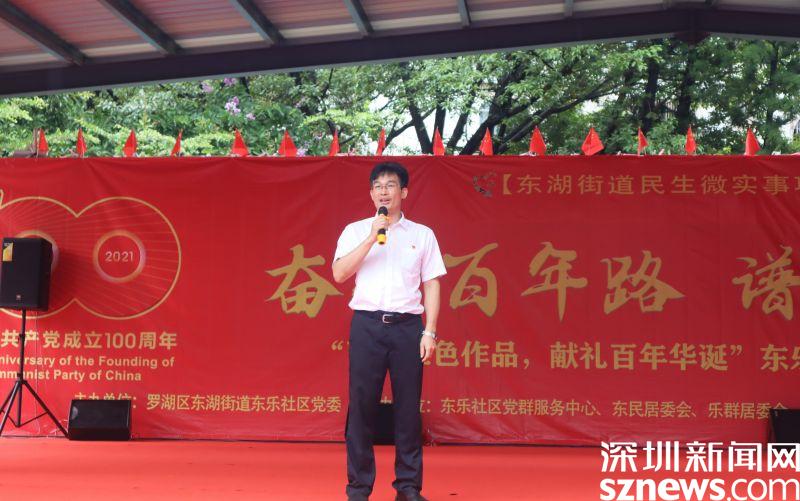 讀特客戶端·深圳新聞網(wǎng)2021年7月30日訊(見習(xí)記者 邱婕 通訊員 黃小花)百年征程波瀾壯闊、百年初心歷久彌堅、百年成就催人奮進(jìn)、百年歌聲唱響今天。7月30日上午,“百幅紅色作品,獻(xiàn)禮百年華誕”東樂社區(qū)建黨100周年慶?;顒釉跂|樂花園文化廣場舉行。東湖街道黨工委副書記、辦事處主任劉慧堅,黨工委副書記、人大工委主任謝統(tǒng)敏,東湖街道二級調(diào)研員、東樂社區(qū)第一書記曾列文,東湖街道辦事處副主任李民,羅湖區(qū)退役軍人事務(wù)局副局長何朝陽,東樂社區(qū)黨委書記劉芳,東樂社區(qū)社工與義工及廣大居民朋友400余人參與此次活動。