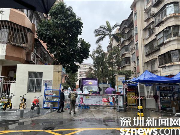 2月22日早上,記者來到處于管控區(qū)域的桂園街道鹿苑小區(qū)。只見身穿防護(hù)服的“大白”們來來往往地在門口忙碌著,偶爾有外賣小哥將外賣放在小區(qū)入口的貨架上便離開,雨水打濕了門前拉起的紅色警戒線。鹿丹村社區(qū)黨委書記陳姍姍披著簡(jiǎn)單的一次性雨衣,不斷響起的電話,居民的一聲聲詢問,都是她需要盡快處理的各項(xiàng)管控工作。