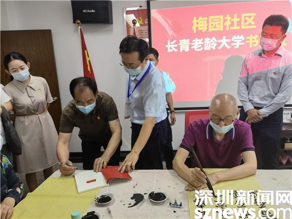 現(xiàn)場,還邀請了梅園社區(qū)長青老齡大學(xué)書法班鄒洪濤老師向大家講解,鄒洪濤既是書法班的老師,也是社區(qū)第十黨支部的支部書記,更是一名基建工程老兵。當(dāng)鄒洪濤介紹家喻戶曉的照片《升》的主人公正是他本人,更是讓王云虎對他豎起了大拇指。他激動(dòng)地表示,鄒洪濤的紅嶺大廈建筑工地上被定格的這張“頂天立地”的照片,是基建工程兵傾力投身改革開放的縮影,展示了深圳經(jīng)濟(jì)特區(qū)初創(chuàng)時(shí)蒸蒸日上的發(fā)展勢頭,是深圳建設(shè)初期時(shí)代張力的見證。
