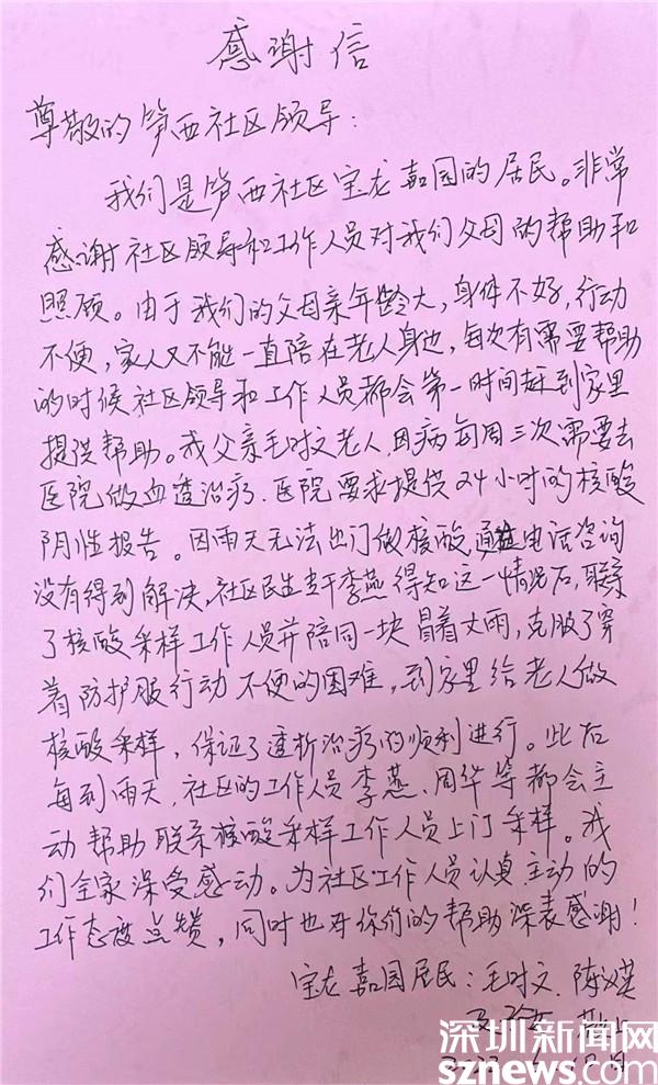 近日,羅湖區(qū)筍崗街道筍西社區(qū)寶龍嘉園住戶(hù)毛時(shí)文的老伴陳漢英阿姨來(lái)到筍西社區(qū)工作站,送上了一封手寫(xiě)的感謝信,感謝社區(qū)提供貼心的上門(mén)核酸采樣服務(wù)。