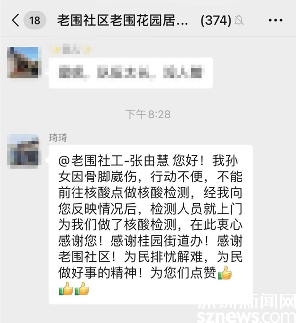 讀特客戶(hù)端·深圳新聞網(wǎng)2022年7月14日訊(記者 劉嘉敏 通訊員 楊紀(jì)歐)7月12日晚上8點(diǎn)多,羅湖區(qū)桂園街道老圍社區(qū)的居民琦琦在居民微信群里向社工張由慧說(shuō):“您好!我孫女因骨腳崴傷,行動(dòng)不便,不能前往核酸點(diǎn)做核酸檢測(cè),經(jīng)我向您反映情況后,檢測(cè)人員就上門(mén)為我們做了核酸檢測(cè),在此衷心感謝您!感謝桂園街道辦!感謝老圍社區(qū)!為民排憂(yōu)解難,為民做好事的精神!為你們點(diǎn)贊?!?/p>