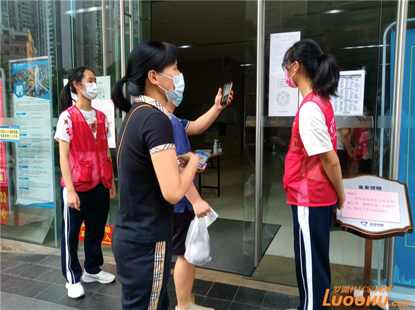 最先上陣的是一對父女兵:蔡玉堂和女兒蔡潤怡,他們利用周末時間在老圍花園E棟單元門值守。這是兩棟高層住宅,兩個單元的人都從這個門進(jìn)出。只見父女倆一個指引進(jìn)入的居民掃場所碼,一個提示測體溫、驗(yàn)碼,倆人分工負(fù)責(zé),配合默契。他們都是老圍社區(qū)蔡屋圍村的居民,對自己的家園有著特殊的情感。今年12的蔡潤怡更是在這里出生長大,許多樓上樓下的鄰居都認(rèn)識她,看她做義工,都親熱地跟她打招呼,并主動配合查驗(yàn)。雖然出入人員較多,但有了父女倆的值守,卡口井然有序。
