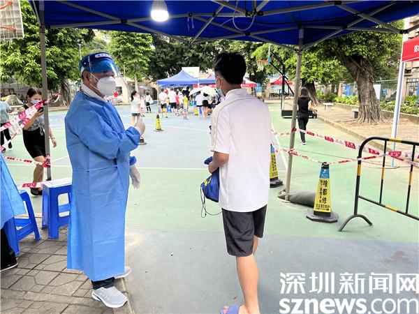 每到下午4點(diǎn),羅湖區(qū)翠竹街道龍屋小區(qū)的籃球場(chǎng)上,都有陸陸續(xù)續(xù)迎來做核酸的居民,而李任平,則會(huì)提前半個(gè)小時(shí)到達(dá)現(xiàn)場(chǎng)準(zhǔn)備,每日如此,風(fēng)雨無阻。穿上防護(hù)服,戴上防護(hù)面罩,將“翠竹街道退役軍人”的臂章戴上,鮮紅的黨員徽章別在胸前,李任平就開始站在核酸檢測(cè)點(diǎn)卡口前,指引做核酸的居民掃碼、亮碼,維持秩序。
