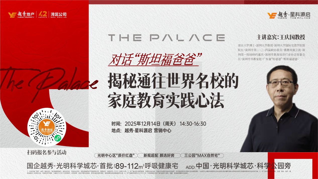 深圳新聞網(wǎng)2025年12月12日訊(記者 何亞南)想知道如何讀懂孩子內(nèi)心、喚醒自主學(xué)習(xí)力?想成為孩子成長(zhǎng)路上的“伙伴”而非“權(quán)威”?12月14日,被稱(chēng)為“斯坦福爸爸”的教育大咖王慶國(guó)教授將空降越秀·星科源啟,帶來(lái)一場(chǎng)干貨滿(mǎn)滿(mǎn)的家庭教育私享會(huì),為家長(zhǎng)們揭秘通往世界名校的實(shí)踐心法。