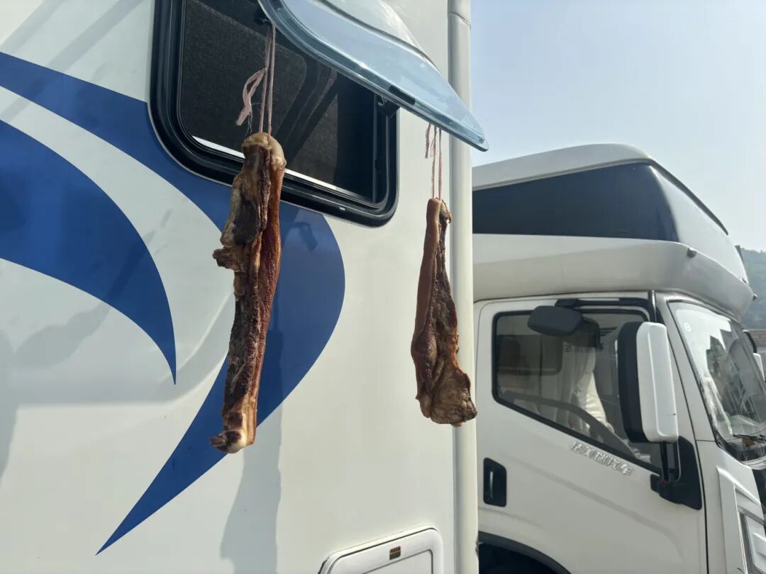 她的丈夫是個講究人,因為老人喜歡吃臘肉,特意在房車窗戶上掛了兩塊臘肉?!斑@是不久前在湖南瀏陽參加煙花節(jié)時買的。”