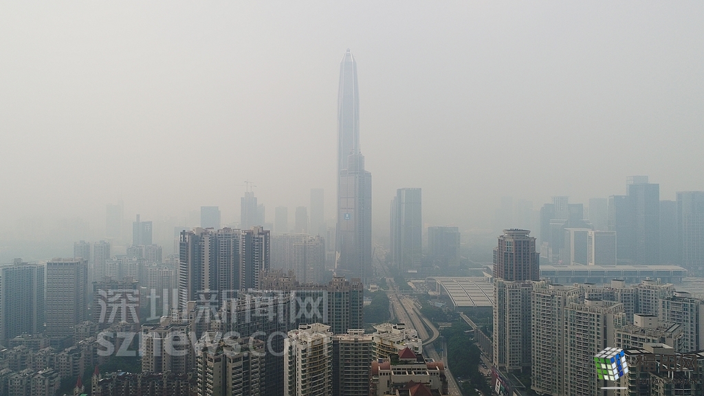 無人機(jī)在數(shù)百米高空俯瞰灰霾籠罩下的深圳中心區(qū),大半個城區(qū)都看不清楚。