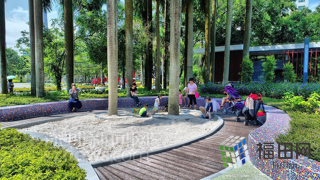 ?香蜜公園內(nèi)許多家長帶著孩子玩耍。