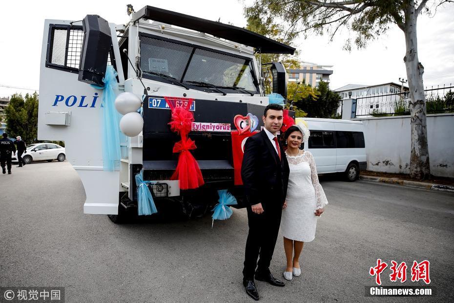 當(dāng)?shù)貢r間2018年3月21日,土耳其安塔利亞,警官Ceren Ekici和Taha YasinGul舉行婚禮。在10個月前的一次行動中,Taha YasinGul不慎開槍擊中Ceren Ekici的頭部,所幸沒有造成生命危險。他們的婚禮由警局同事操辦,同事們舉著防彈盾牌,護送這對新人走向禮臺。圖片來源:視覺中國
