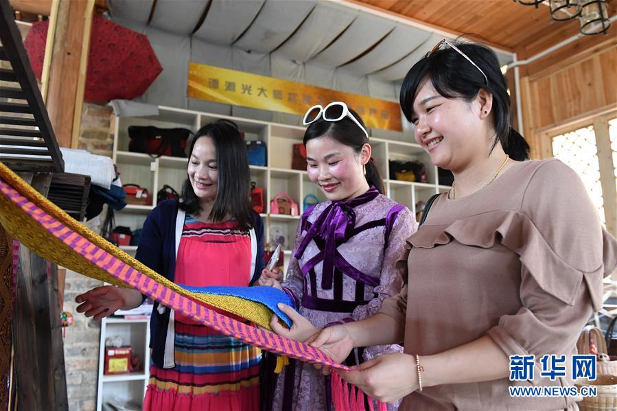 4月19日,在廣西南寧市青秀區(qū)南陽鎮(zhèn)施厚村古岳坡,游客在參觀用于制作民族工藝品的布料。今年“壯族三月三”假期期間,不少市民游客前往鄉(xiāng)村旅游觀光,激發(fā)了一股鄉(xiāng)村旅游小熱潮?!皦炎迦氯笔菑V西壯族自治區(qū)確定的法定假期。新華社記者陸波岸 攝