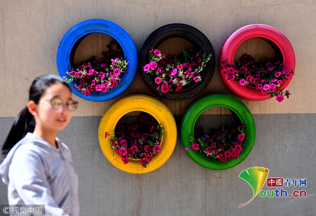 5月4日,二十余個印有卡通圖案及奧運(yùn)五環(huán)造型等創(chuàng)意輪胎花盆亮相沈陽,吸引市民。