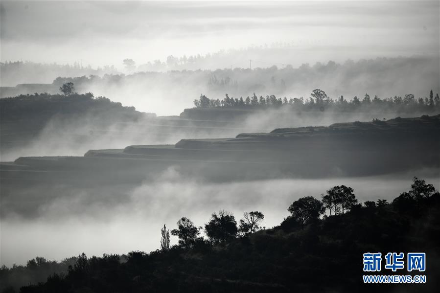 云霧繚繞的寧夏彭陽(yáng)縣金雞坪梯田公園(7月17日攝)。
