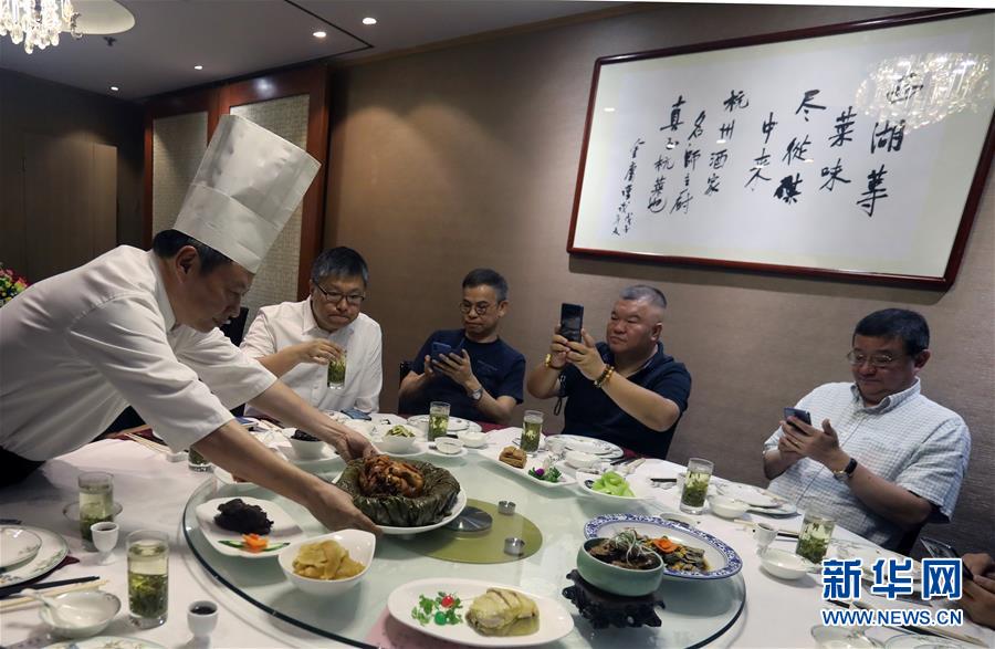 杭州酒家老板吳瑞康向記者介紹“叫化雞”的制作工序(6月16日攝)。 金庸在武俠小說《神雕俠侶》中借郭靖之口說過: “為國為民,俠之大者?!蔽鋫b精神在香港備受推崇,有其心向中華文化的情感基礎(chǔ)。在這個國際美食之都,品味舌尖上的武俠味,內(nèi)中的感覺別有深意。新華社記者 李鵬 攝