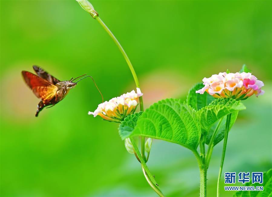 在福建省福州市溫泉公園,蜂鳥鷹蛾在花間飛舞(8月18日攝)。近日,福建省福州市溫泉公園內的馬纓丹大面積開放。花紅、草綠、蟲飛,構成了一幅和諧的閩都生態(tài)圖景。 新華社記者梅永存攝