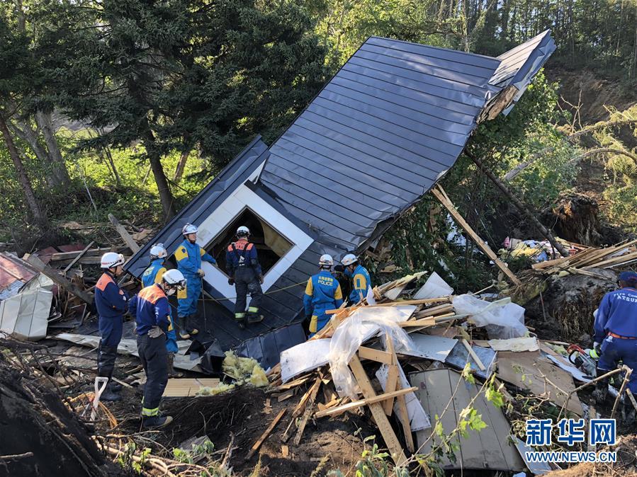9月6日,在日本北海道厚真町,救援人員在一處倒塌的房屋附近搜救。新華社記者鄧敏攝