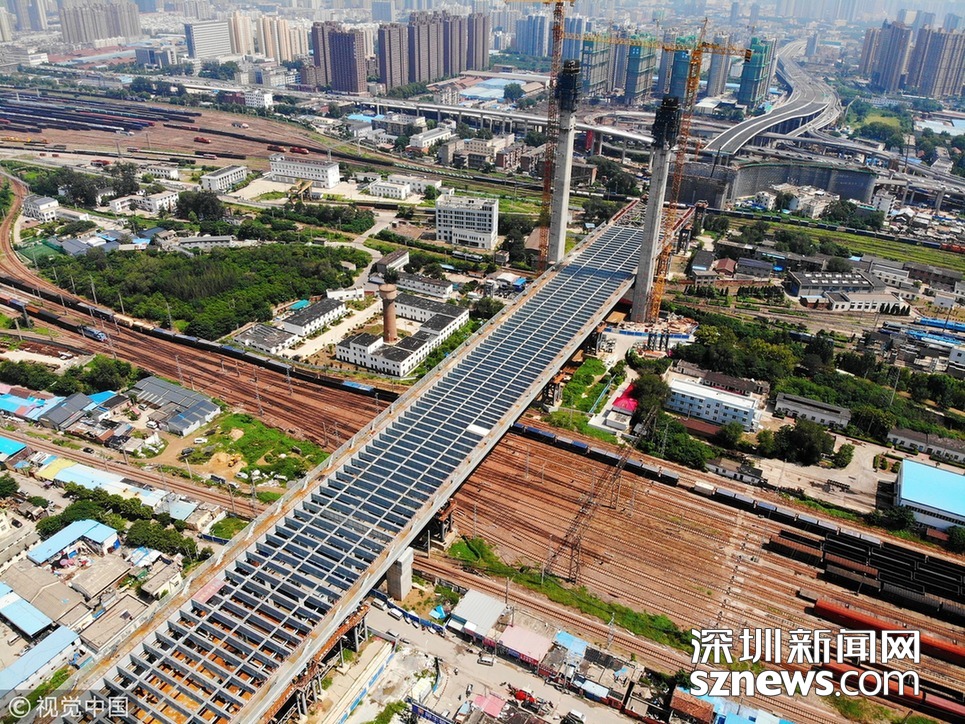 深圳新聞網(wǎng)訊 2018年8月19日,鄭州,跨亞洲最大火車站編組站的農(nóng)業(yè)路高架鄭北大橋工程開始最后一輪頂推,長度為160米,約占總頂推長度的1/3,頂推重量達(dá)到9000噸。
