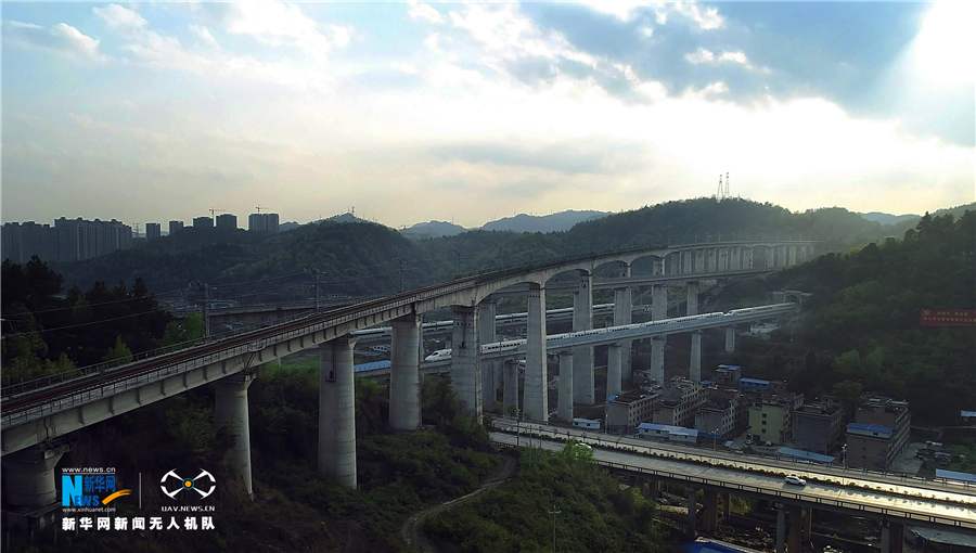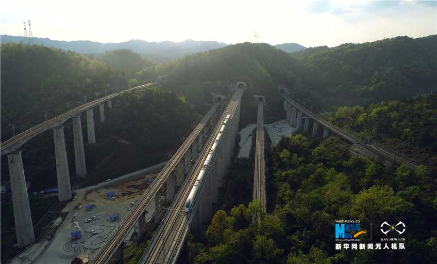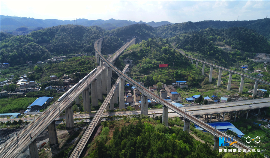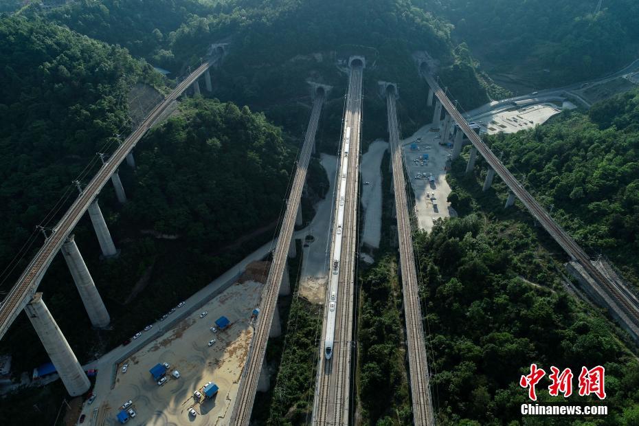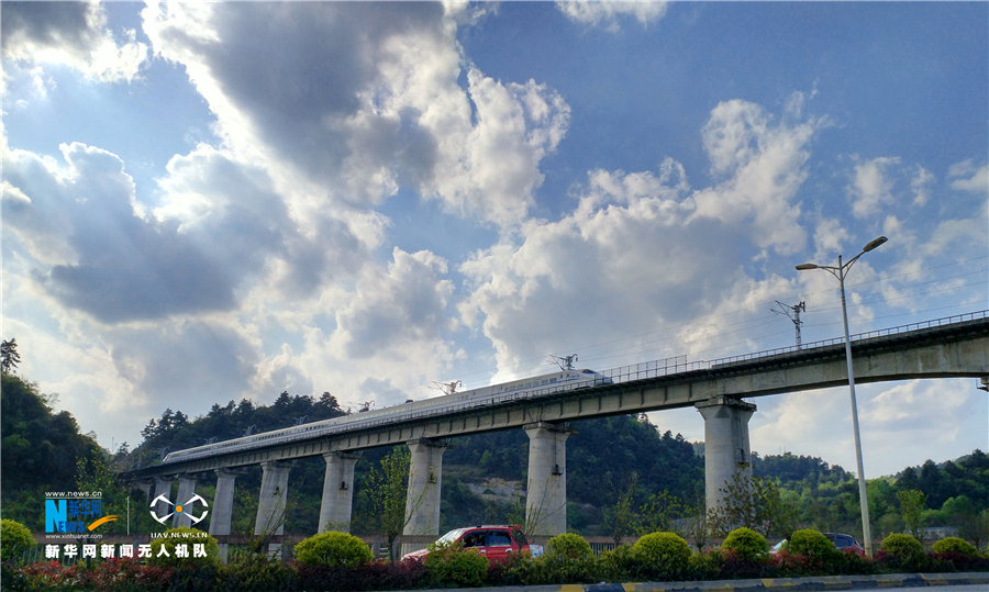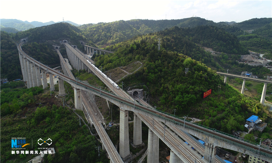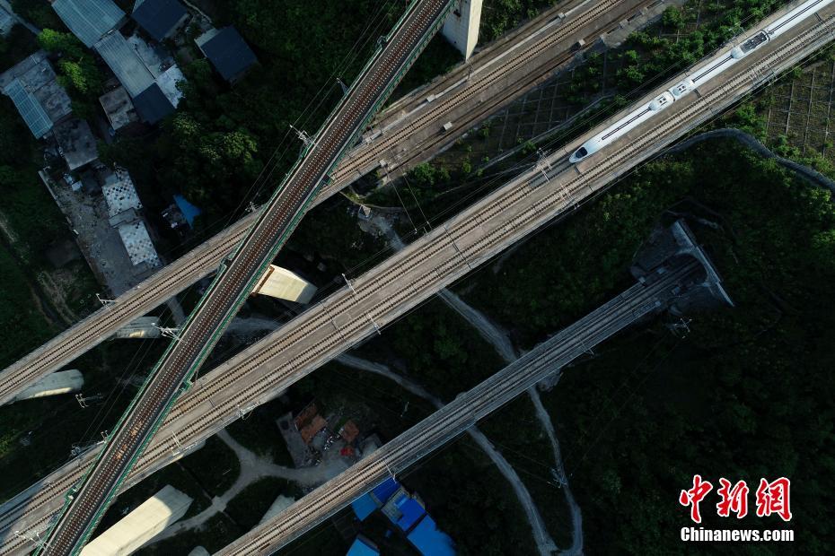 5月16日,航拍貴陽市郊交織的五條高鐵線路,一列動車駛出隧道。貴州省地處中國西南腹地,高原山地居多,因此高鐵建設(shè)的橋隧占比較高。在貴陽市烏當(dāng)區(qū)新添寨,高鐵滬昆線、貴廣客運專線、貴開城際客運專線的隧道和橋梁交織在一起,形成“五洞五橋”并行。中新社記者賀俊怡 攝 5月16日,一列動車從貴陽市郊交織的橋梁上駛過。貴州省地處中國西南腹地,高原山地居多,因此高鐵建設(shè)的橋隧占比較高。在貴陽市烏當(dāng)區(qū)新添寨,高鐵滬昆線、貴廣客運專線、貴開城際客運專線的隧道和橋梁交織在一起,形成“五洞五橋”并行。中新社記者賀俊怡 攝
