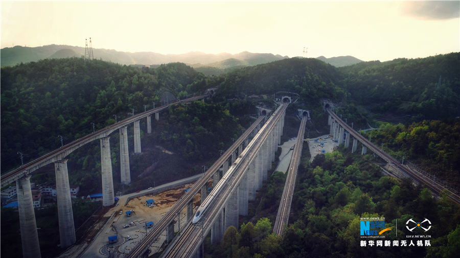 貴州省地處中國(guó)西南腹地,全省高原山地居多,因此高鐵建設(shè)的橋隧占比較高。在貴陽(yáng)市烏當(dāng)區(qū)新添寨,高鐵滬昆線、貴廣客運(yùn)專線、貴開城際客運(yùn)專線的隧道和橋梁交織在一起,形成“五洞五橋”并行,形似“五龍出?!钡膲延^景象(3月29日攝)。新華網(wǎng)盧志佳 攝