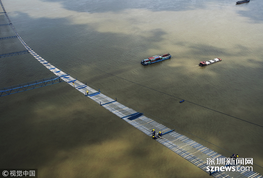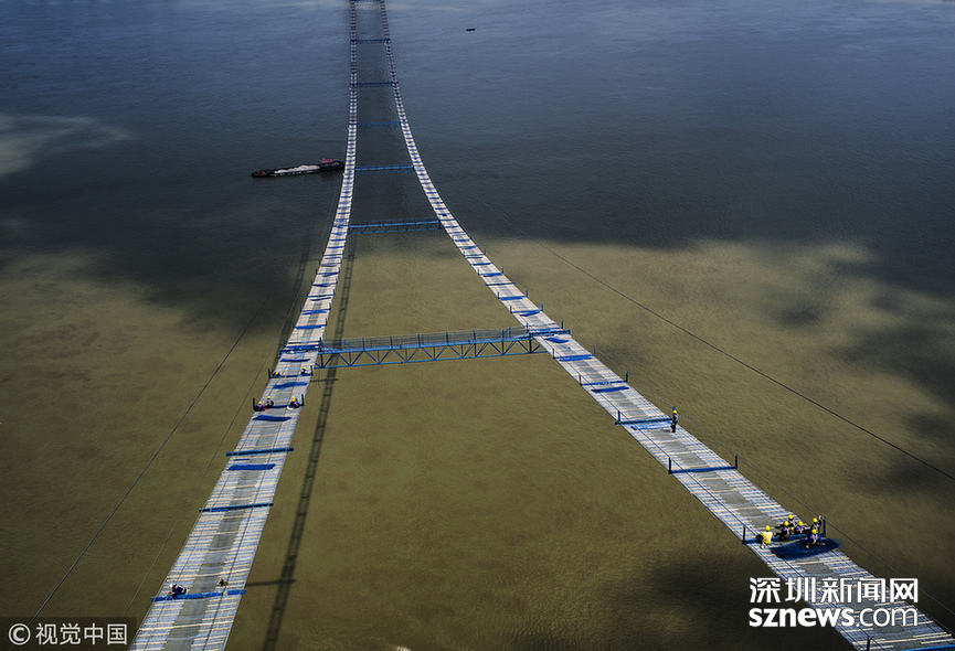 2018年5月14日,武漢,武漢楊泗港長江大橋上空,上部結(jié)構(gòu)施工進(jìn)入貓道面網(wǎng)鋪設(shè)階段,數(shù)十名中鐵大橋局工人在跨江高空拼搏趕超,江面上空的臨時(shí)“吊橋”悄然形成。數(shù)十名工人在長江上空228米處拼搏趕超,臨時(shí)“天梯”悄然形成。