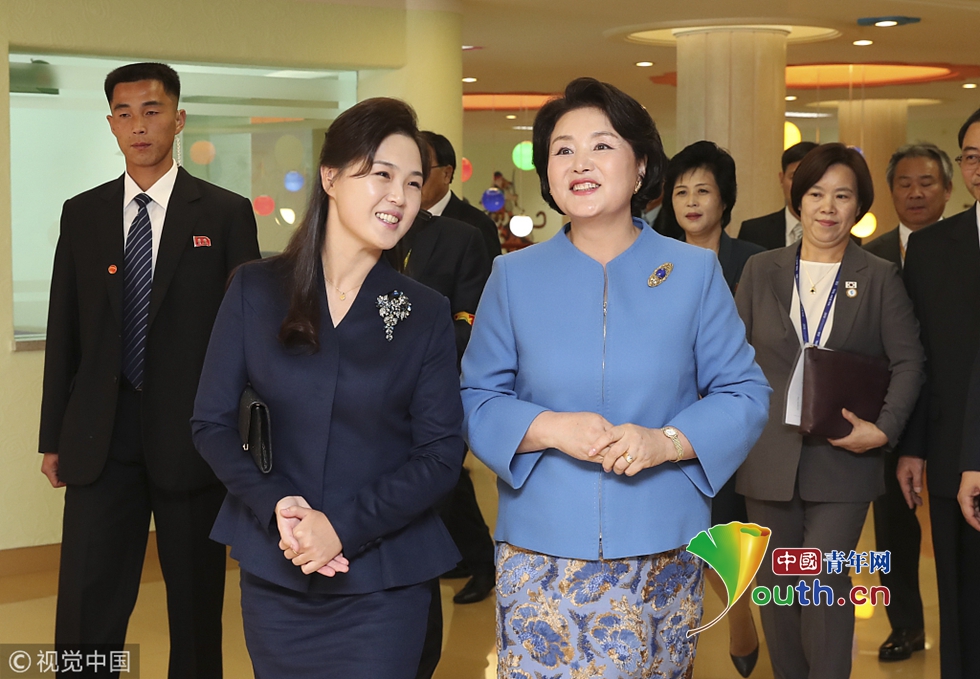 當(dāng)?shù)貢r(shí)間2018年9月18日,朝鮮平壤,韓國(guó)總統(tǒng)文在寅夫人金正淑在朝鮮國(guó)務(wù)委員會(huì)委員長(zhǎng)金正恩夫人李雪主的陪同下參觀平壤金元均音樂(lè)大學(xué)。圖片作者:視覺中國(guó)