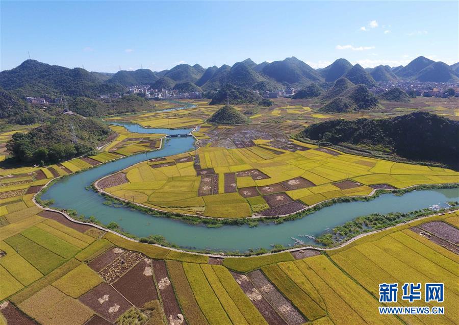 這是廣南縣八寶鎮(zhèn)壩龍村的稻田景色(9月20日無人機拍攝)。 云南省文山壯族苗族自治州廣南縣八寶鎮(zhèn)今年種植優(yōu)質(zhì)水稻22000余畝,秋收季節(jié),田野里一片金黃,景色如畫。 新華社記者楊宗友攝