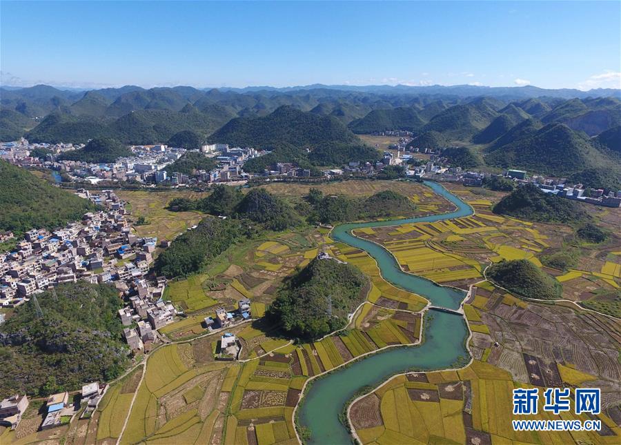 這是廣南縣八寶鎮(zhèn)壩龍村的田園景色(9月20日無人機(jī)拍攝)。 云南省文山壯族苗族自治州廣南縣八寶鎮(zhèn)今年種植優(yōu)質(zhì)水稻22000余畝,秋收季節(jié),田野里一片金黃,景色如畫。 新華社記者楊宗友攝