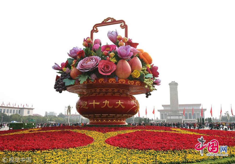 2017年天安門廣場大花籃以喜慶的花果籃為主景,花籃頂高17米,籃體高15.3米,底部直徑達(dá)50米?;@體南側(cè)寫有“祝福祖國、1949-2017”,北側(cè)寫有“喜迎十九大” 字樣。花果籃內(nèi)共使用主花56朵(牡丹、月季、玉蘭、金桂、迎春花、蘋果花、紫藤花、文心蘭、葉子花),其中最大牡丹直徑3.2米,果實(shí)6種(石榴、桃、柿子、蘋果、海棠、葡萄)。寓意吉祥的果實(shí)和花卉,象征十八大以來,黨和國家在各個(gè)領(lǐng)域取得的輝煌成就,碩果累累。底部花壇采用心形圖案,寓意紅心向黨,象征著全國人民緊密團(tuán)結(jié)在以習(xí)近平同志為核心的黨中央周圍,表達(dá)對祖國繁榮富強(qiáng)、欣欣向榮的美好祝福。