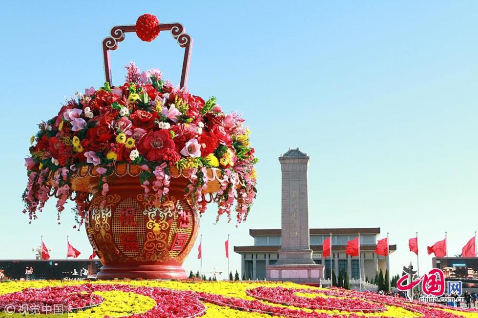2012年天安門廣場中心花壇以“祝福祖國”為主題,以喜慶的花籃為主景?;▔睆?0米、頂高15米,以紅黃兩色為主打,花籃外圍,環(huán)繞著花草組成的祥云圖案。同時(shí),主花壇設(shè)有燈光效果,即便是夜間游賞,也能清晰地看到“花容”。祝福祖國“花籃”凈高13米,籃盤直徑11米,真假花結(jié)合,選取牡丹、桃花、紫藤、百合等18個(gè)品種的花卉,最大花卉直徑2米?!盎ɑ@”通體中國紅,體現(xiàn)喜慶、祝福之意,配有金色紋絡(luò),莊重、華貴。籃體鑲嵌三組“祝?!?、“祖國”字樣的燈箱?!盎ɑ@”底面是一品紅和小菊組成的如意圖案。