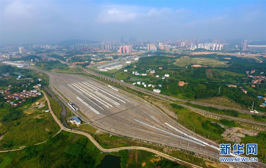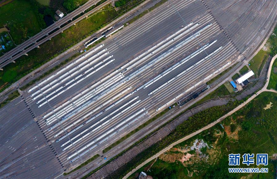 這是廣西南寧動(dòng)車所內(nèi)準(zhǔn)備發(fā)往各地的動(dòng)車組列車(6月18日無人機(jī)拍攝)。 廣西壯族自治區(qū)成立60年來,鐵路建設(shè)發(fā)生翻天覆地的變化。來自中國(guó)鐵路南寧局集團(tuán)有限公司的數(shù)據(jù)顯示,1958年廣西鐵路總里程為1346.3公里,如今廣西鐵路總里程達(dá)5191公里。廣西與周邊相鄰省份間實(shí)現(xiàn)動(dòng)車“公交化”開行。此外,北部灣港—重慶班列、東盟海產(chǎn)品冷鏈班列、“百色一號(hào)”果蔬專列等的開通和運(yùn)營(yíng),強(qiáng)化了鐵路供給的針對(duì)性和有效性。鐵路成為助推廣西經(jīng)濟(jì)社會(huì)快速發(fā)展的“大動(dòng)脈”。 新華社記者黃孝邦攝