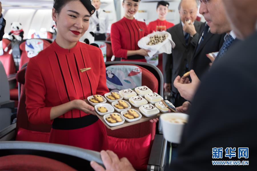 9月26日,在以色列特拉維夫本·古里安國際機場,四川航空公司空乘人員在機上展示熊貓主題的小吃。 新華社記者郭昱攝