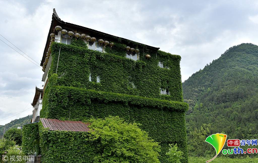 2018年5月9日,湖北恩施,在宣恩縣高羅鎮(zhèn)板寮村,被爬山虎包圍的“綠色民居”。