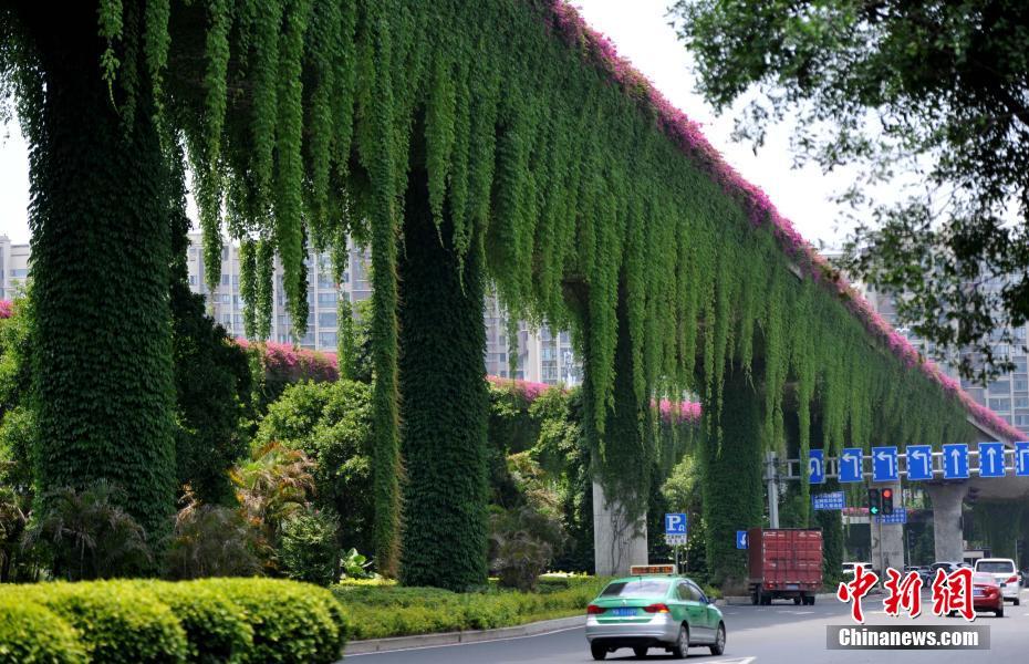 5月13日,福州市區(qū)一立交橋長滿了枝葉繁茂的爬山虎,遠遠望去,好像穿上了一件“綠衣”,成為福州街頭一景。中新社記者 張斌攝