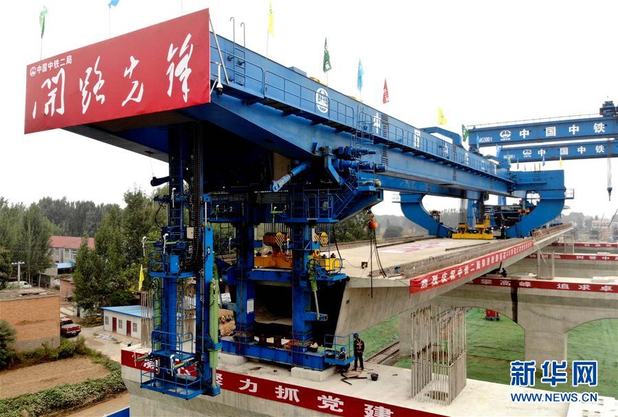 9月27日,中鐵二局的施工人員使用大型機械在鄭(州)濟(南)高速鐵路(鄭濮段)站前工程VI標施工現(xiàn)場架設(shè)40米簡支箱梁(無人機拍攝)。 新華社記者李安攝