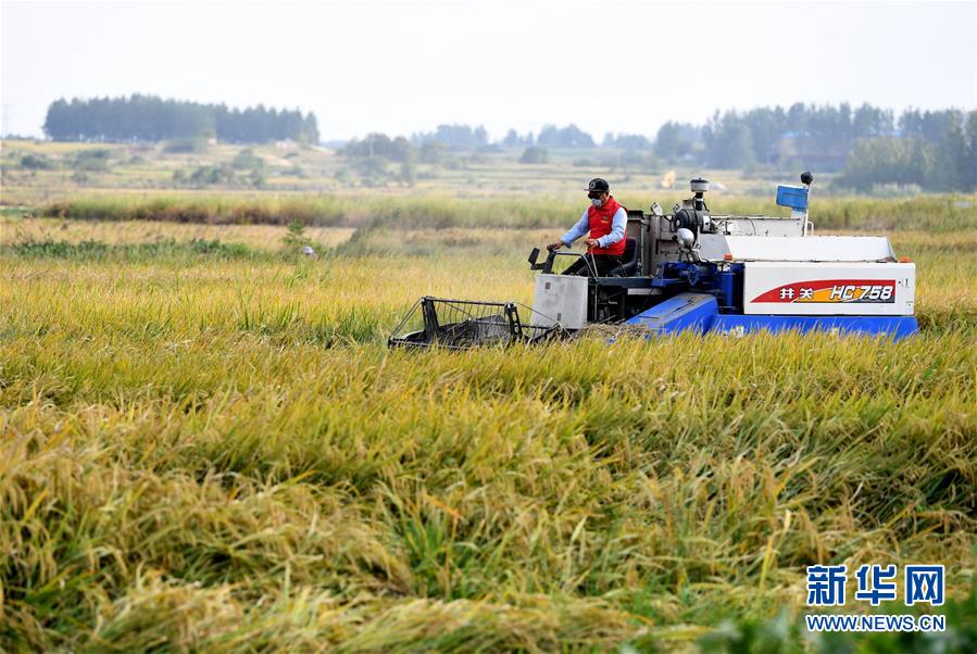 9月27日,在鳳陽縣小崗村,農民駕駛收割機收割水稻。新華社記者 劉軍喜 攝
