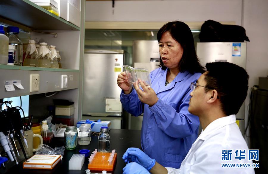 中科院植物生理生態(tài)研究所鄭慧瓊研究員(左)和學(xué)生在實(shí)驗(yàn)室研究擬南芥(9月14日攝)。新華社記者張建松攝