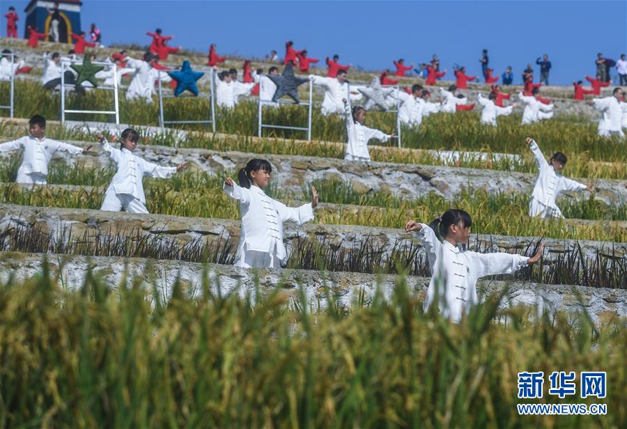 9月29日拍攝的秋日中的建德市大洋鎮(zhèn)高垣村梯田風(fēng)景。當日,2000多名太極拳愛好者在浙江省建德市大洋鎮(zhèn)高垣村的千畝梯田上參加太極拳表演,吸引很多當?shù)厝撕陀慰颓皝碛^賞,助力當?shù)亟鹎飼r節(jié)鄉(xiāng)村旅游。近兩年來,大洋鎮(zhèn)充分利用土地整治后形成的千畝梯田打造農(nóng)業(yè)觀光綜合體,發(fā)展綜合型農(nóng)業(yè)觀光旅游,為鄉(xiāng)村振興注入新活力。新華社記者徐昱攝