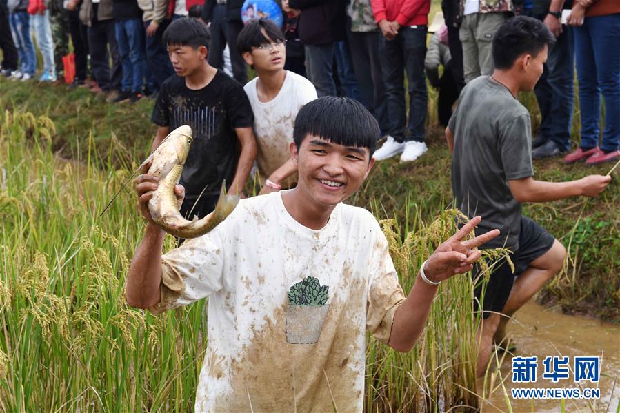 9月29日,一名小伙子展示摸到的魚。9月29日,云南省尋甸回族彝族自治縣2018年首屆農(nóng)民豐收節(jié)暨第二屆摸魚節(jié)在雞街鎮(zhèn)舉行,當(dāng)?shù)剞r(nóng)民和游客在豐收的稻田里進行摸魚、拔谷穗、山歌對唱等活動,享受收獲的喜悅。新華社記者楊宗友攝