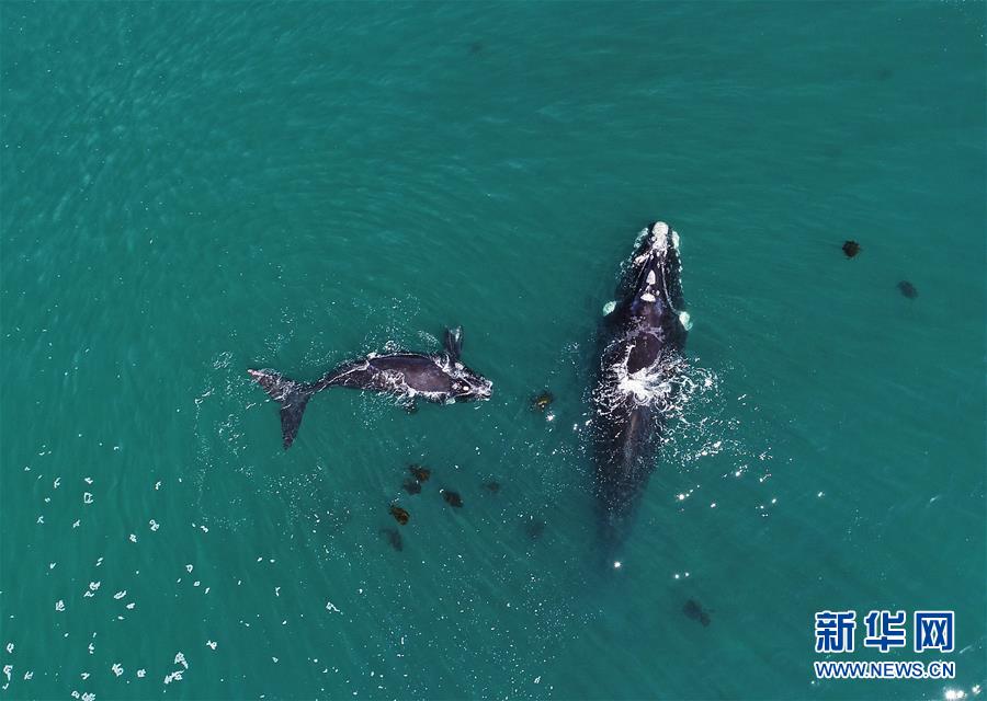 9月30日,在南非赫曼紐斯小鎮(zhèn)附近海面上,2頭南露脊鯨在海岸邊暢游。9月29日,位于開普敦以東約115公里的赫曼紐斯小鎮(zhèn)迎來(lái)2018年的鯨魚節(jié),來(lái)自世界各地的游客可乘船出海觀鯨,也可在岸邊等待鯨魚的到來(lái)。新華社記者陳誠(chéng)攝