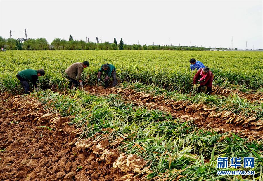 10月9日,秦皇島市撫寧區(qū)留守營鎮(zhèn)桑園村農(nóng)民在收獲生姜。 近年來,河北省秦皇島市撫寧區(qū)在農(nóng)業(yè)結(jié)構(gòu)調(diào)整過程中,引導(dǎo)當(dāng)?shù)剞r(nóng)民種植優(yōu)質(zhì)無公害生姜,并安排農(nóng)業(yè)技術(shù)員定期到田間指導(dǎo)農(nóng)民對生姜進行標(biāo)準(zhǔn)化管理。據(jù)介紹,今年該縣生姜種植面積1萬多畝,預(yù)計產(chǎn)生姜5萬噸,種植戶每畝純收入達(dá)1萬多元。 新華社記者 楊世堯 攝