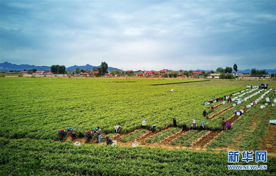 10月9日,秦皇島市撫寧區(qū)留守營鎮(zhèn)桑園村農(nóng)民在收獲生姜(無人機(jī)拍攝)。 近年來,河北省秦皇島市撫寧區(qū)在農(nóng)業(yè)結(jié)構(gòu)調(diào)整過程中,引導(dǎo)當(dāng)?shù)剞r(nóng)民種植優(yōu)質(zhì)無公害生姜,并安排農(nóng)業(yè)技術(shù)員定期到田間指導(dǎo)農(nóng)民對生姜進(jìn)行標(biāo)準(zhǔn)化管理。據(jù)介紹,今年該縣生姜種植面積1萬多畝,預(yù)計產(chǎn)生姜5萬噸,種植戶每畝純收入達(dá)1萬多元。 新華社記者 楊世堯 攝