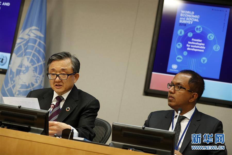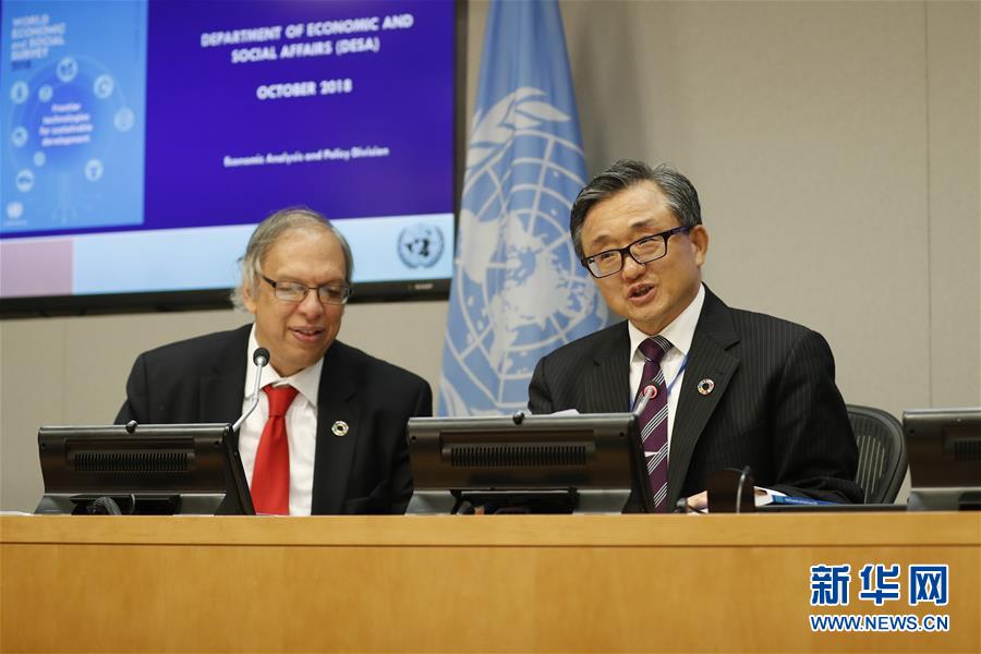 10月8日,在位于紐約的聯(lián)合國總部,聯(lián)合國負(fù)責(zé)經(jīng)濟(jì)和社會(huì)事務(wù)的副秘書長劉振民(右)向記者介紹《2018年世界經(jīng)濟(jì)和社會(huì)概覽》。 新華社記者李木子攝