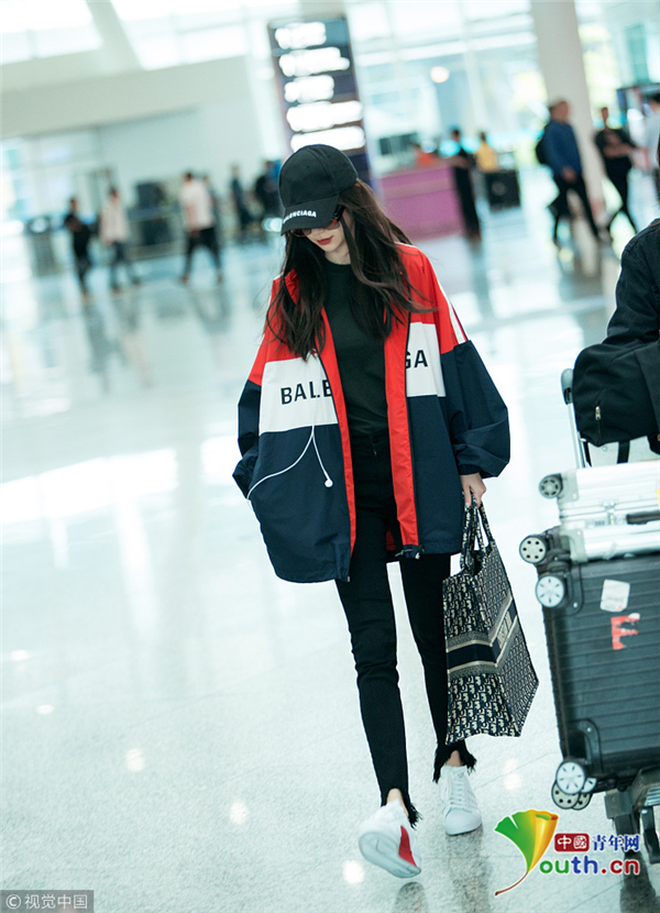 2018年10月11日,深圳,Angelababy現身深圳機場,頭戴鴨舌帽的她露出半張小臉紅唇嬌艷,一身休閑裝扮時尚靚麗,手中的大包與她纖瘦的身材形成鮮明對比,十分搶鏡,在上身的寬大運動衣襯托下,套著緊身褲的雙腿更顯細長。