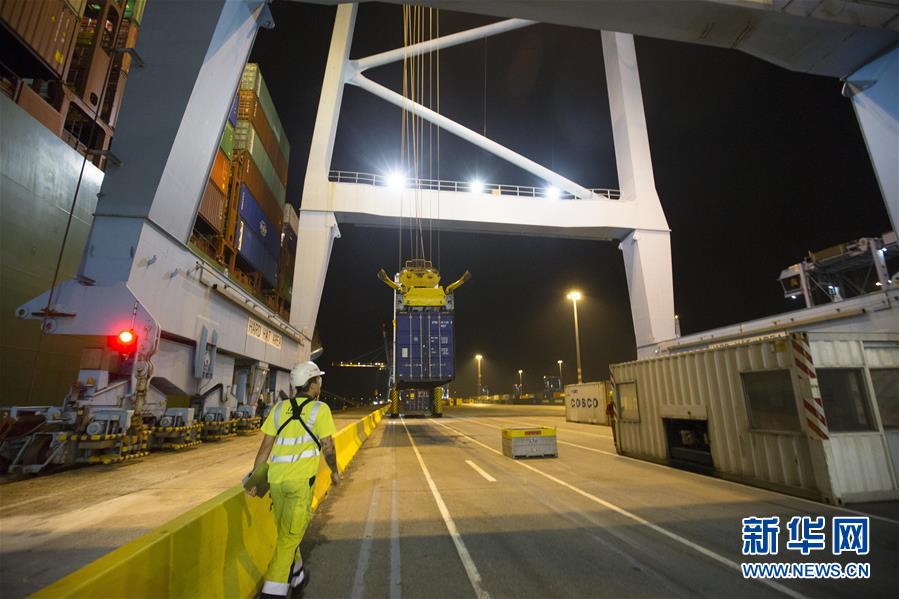 10月15日晚,吊車(chē)在比利時(shí)澤布呂赫港集裝箱碼頭進(jìn)行裝卸作業(yè)。 新華社記者 葉平凡 攝