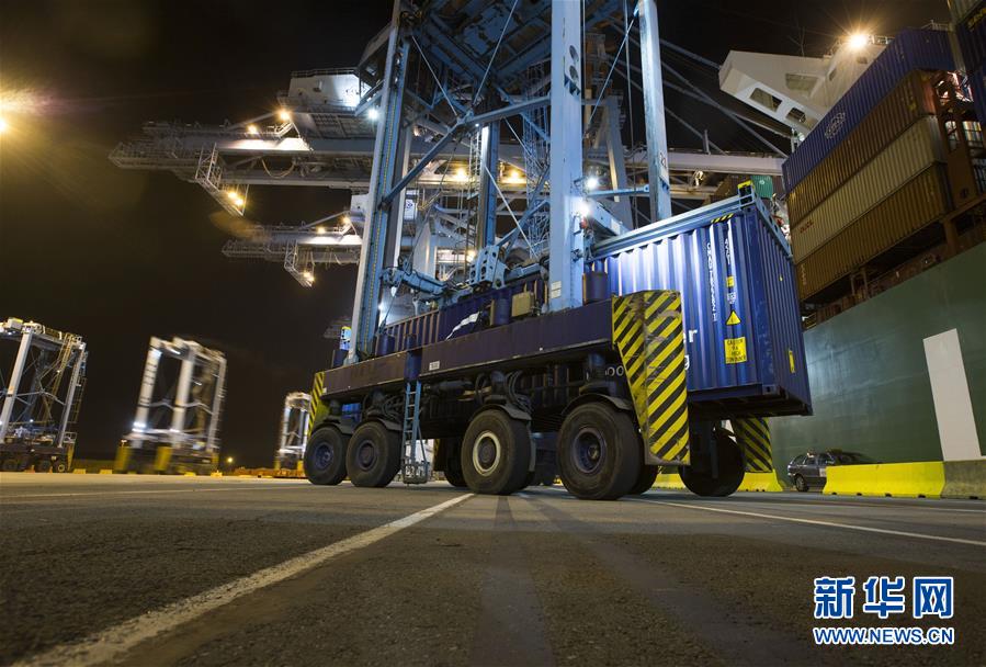 10月15日晚,在比利時(shí)澤布呂赫港集裝箱碼頭,跨運(yùn)車(chē)運(yùn)送集裝箱。 新華社記者 葉平凡 攝