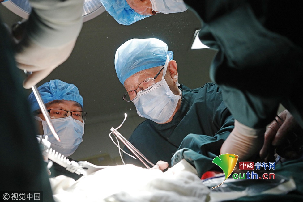 2018年4月13日,在江蘇省徐州市第一人民醫(yī)院手術(shù)室,96歲高齡的“中國(guó)肝膽外科之父”、中國(guó)科學(xué)院院士吳孟超親自為患者進(jìn)行手術(shù)。當(dāng)日,吳孟超院士和中國(guó)人民解放軍海軍軍醫(yī)大學(xué)附屬東方肝膽外科醫(yī)院的醫(yī)療團(tuán)隊(duì)來到江蘇徐州為患者進(jìn)行手術(shù)。 殷立勤/視覺中國(guó)